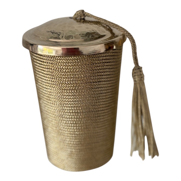 - Contenant : verre sabra tressé à la main en soie végétale doté d’un couvercle en maillechort, agrémenté d’une très élégante passementerie.
