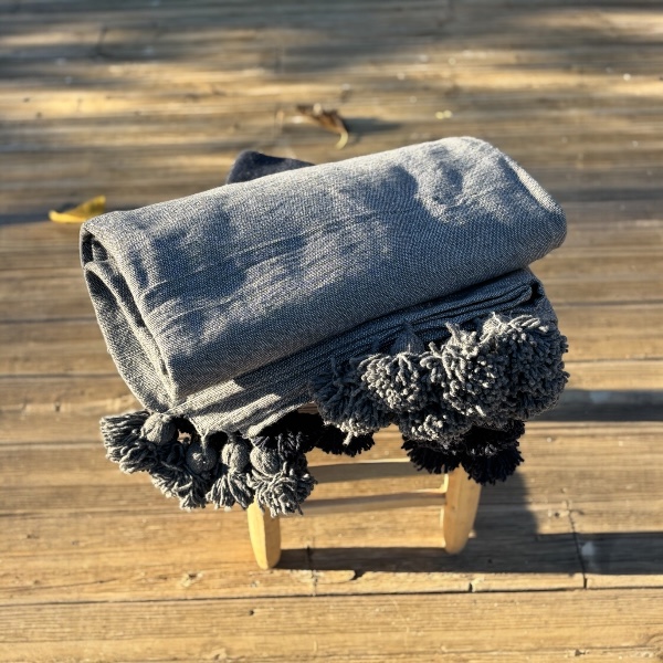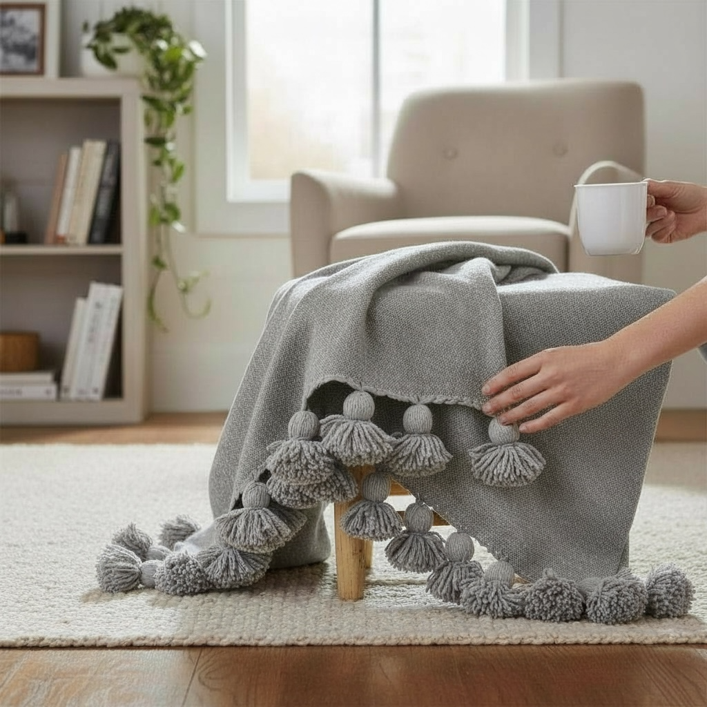 Avec sa texture douce, ses finissions minutieuses et ses pompons généreux, cette couverture apporte immédiatement chaleur, élégance et caractère à votre décor.