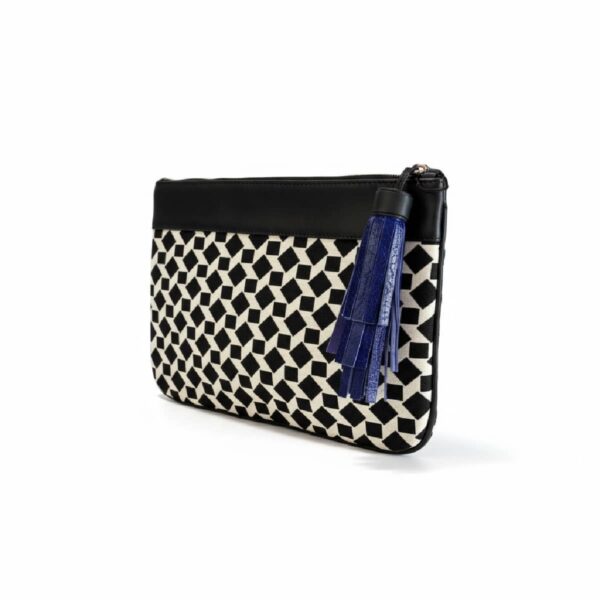 Pochette en toile graphique et cuir, agrémentée d’un pompon en sky bleu majorelle