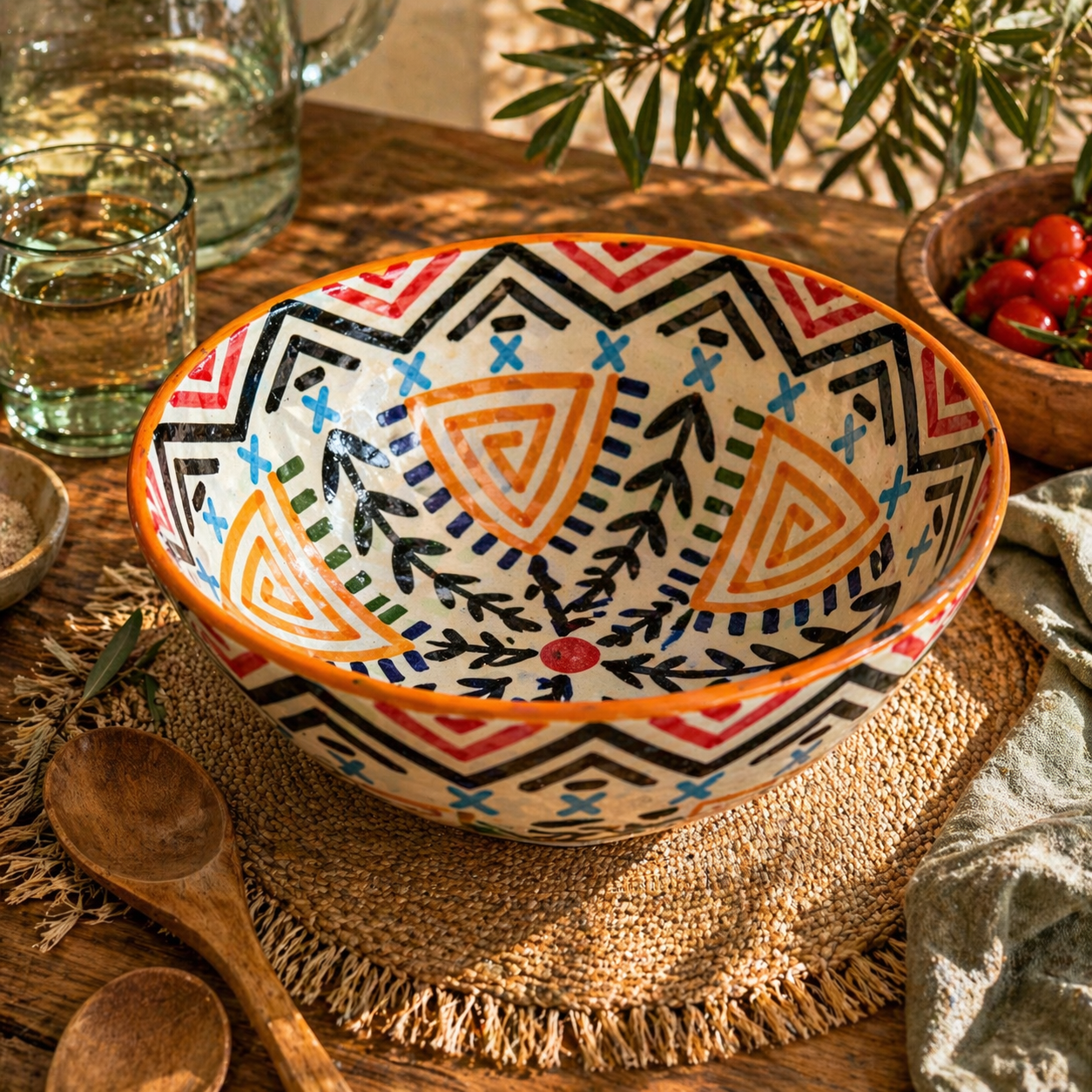 Ce saladier s’intègre naturellement dans une vaisselle marocaine colorée et authentique.
