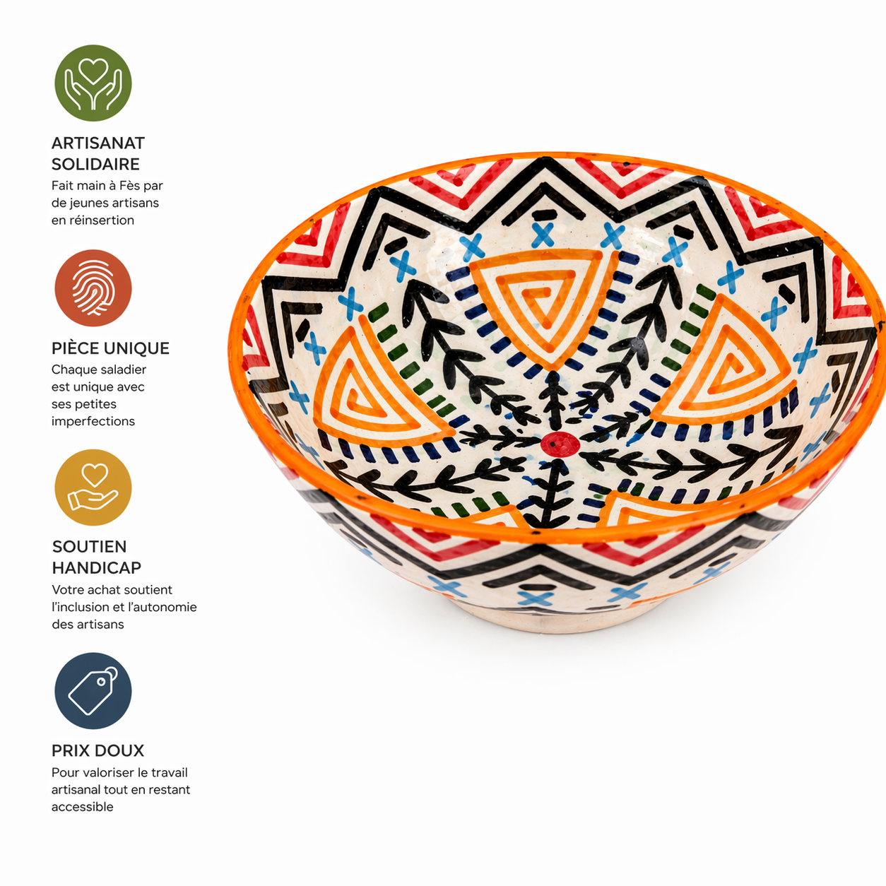 Ce saladier marocain peint à la main révèle un travail d’une grande précision. Réalisé à Fès par de jeunes artisans en réinsertion, il témoigne d’un effort constant, où chaque motif demande concentration et maîtrise du geste.