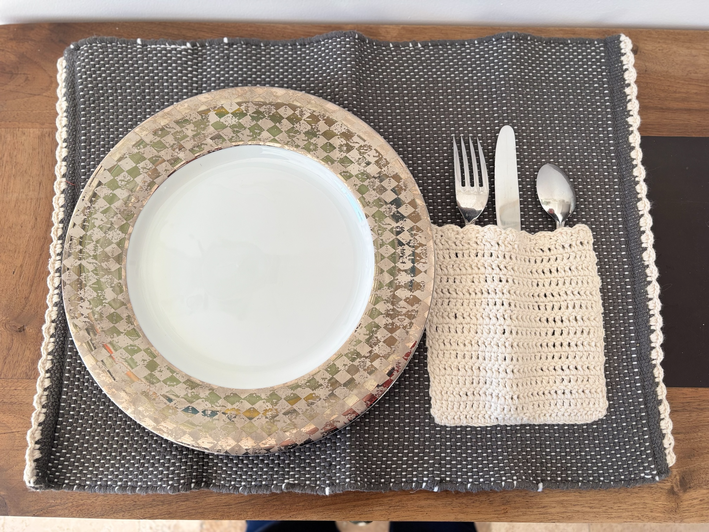 – Les femmes, expertes en finitions, crochettent et cousent à la main la poche destinée aux couverts, puis ajoutent sur les côtés deux bandes crochetées qui insufflent au set une allure poétique, bohème et chaleureuse.