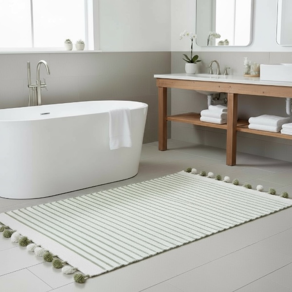Ajoutez du caractère à votre salle de bain avec ce tapis de bain tissé sur métiers traditionnels au Maroc. Réalisé en 100 % coton, il offre une belle épaisseur, une excellente absorption et une résistance idéale pour un usage quotidien.