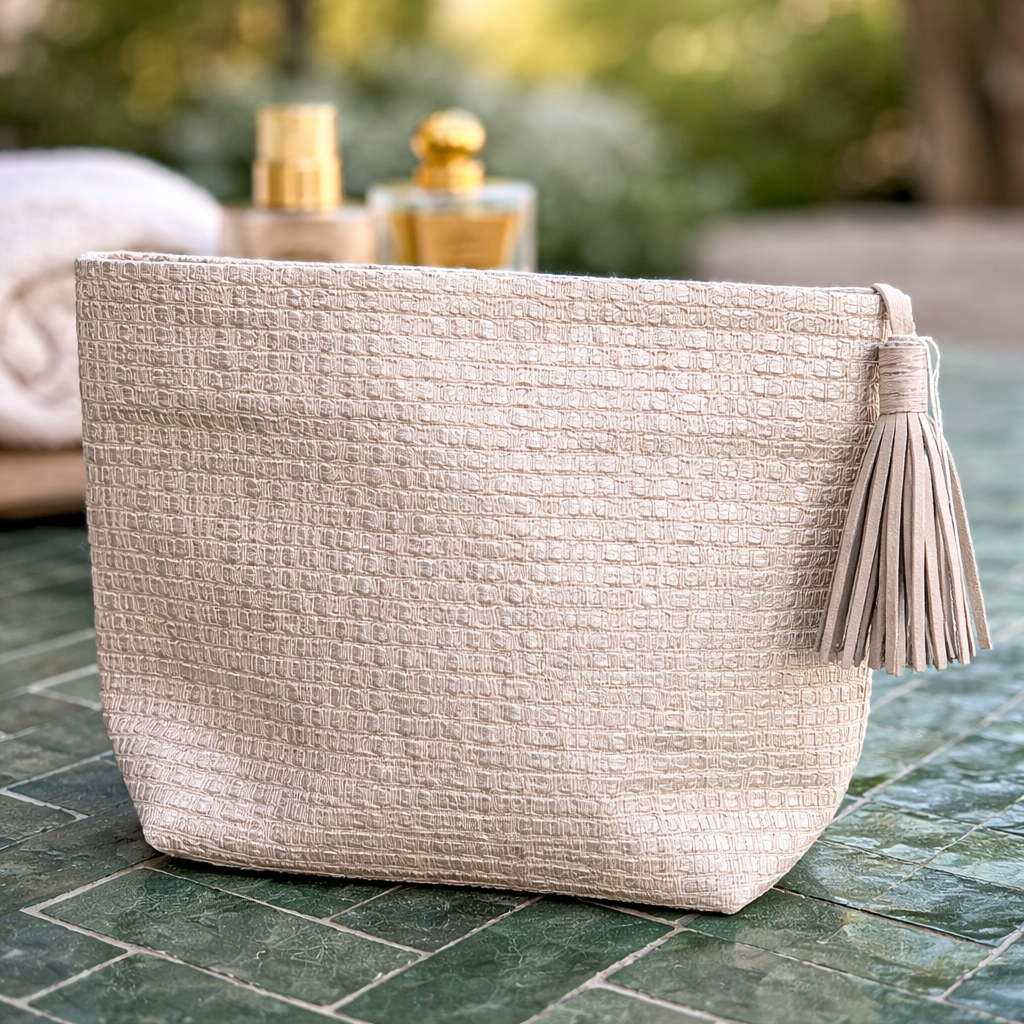 Trousse artisanale beige en simili cuir tissé maroc