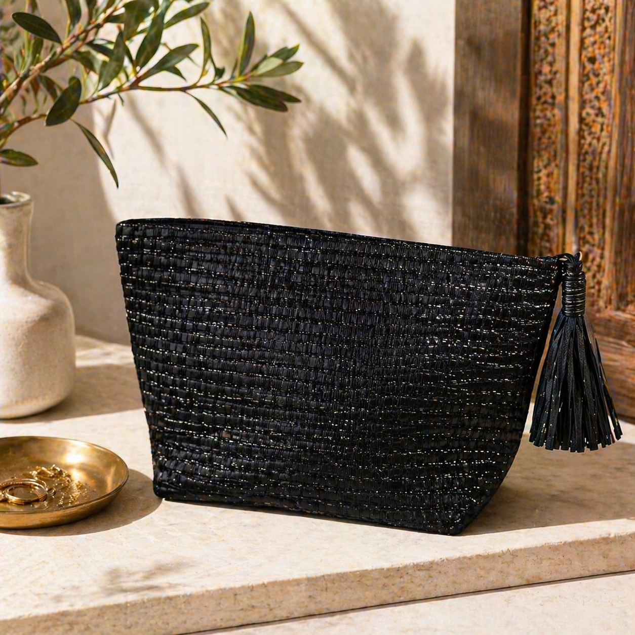 Dès le premier regard, cette trousse artisanale noire séduit par la profondeur de sa teinte et la finesse de son tissage. Confectionnée à la main, elle reflète un équilibre subtil entre élégance et utilité.