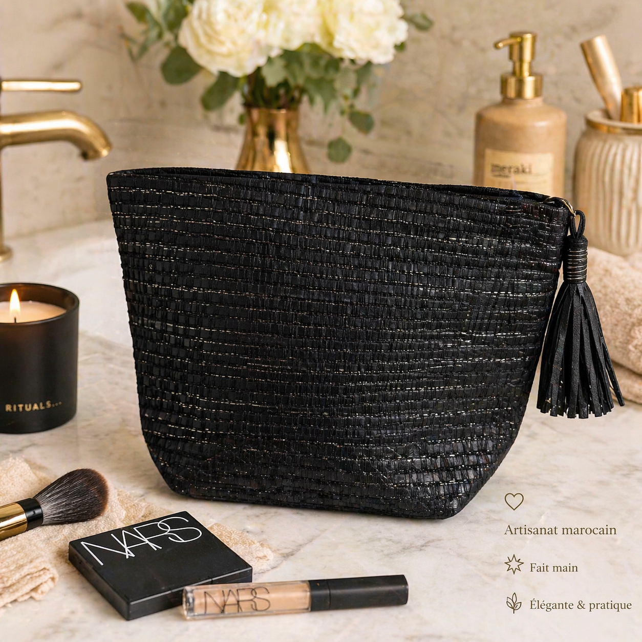 Chaque trousse artisanale noire est réalisée par des coopératives de femmes marocaines, perpétuant un savoir-faire textile transmis de génération en génération.